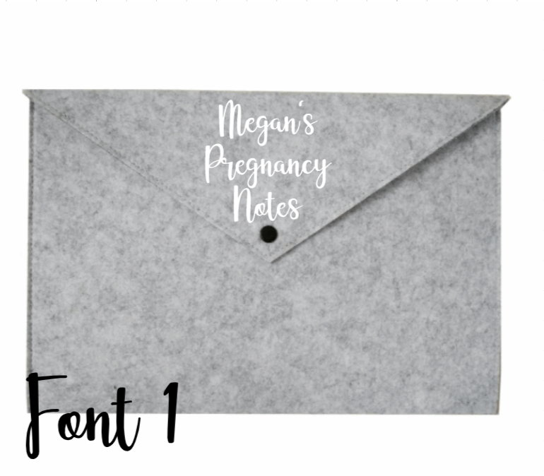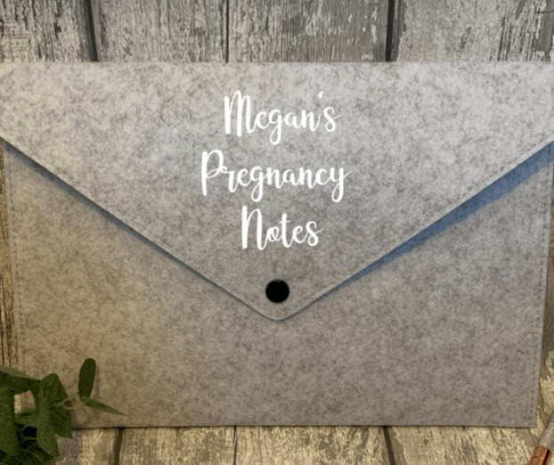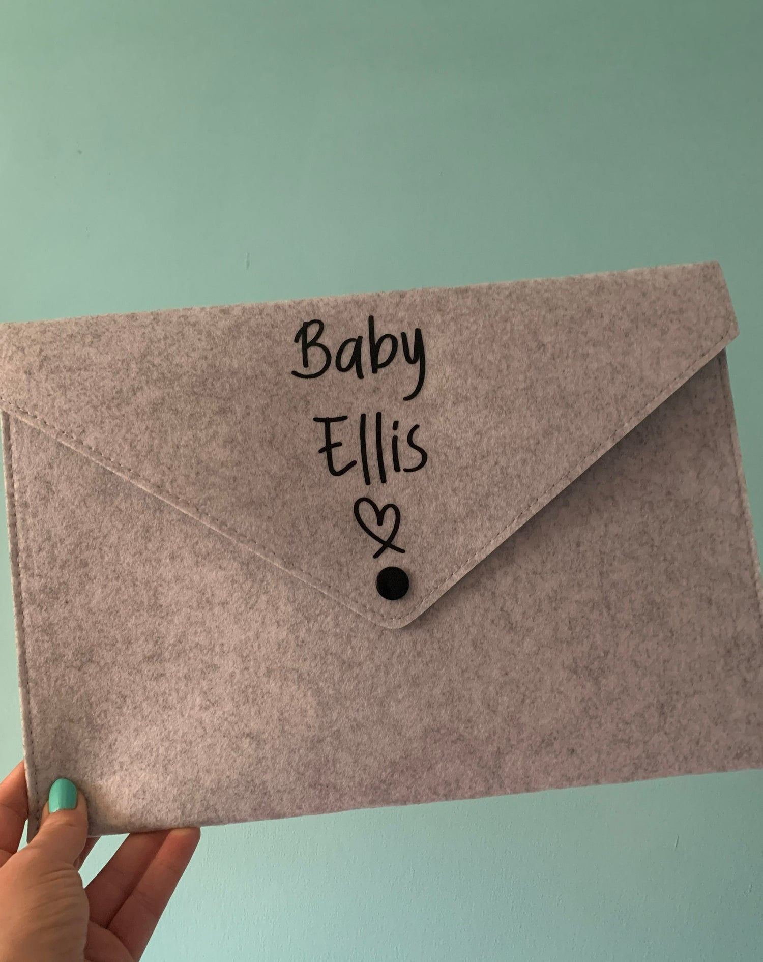 A4 felt folder in light grey with black popper closing. Perfect for keeping all your important documents and notes together. Use to store pregnancy notes, insurance documents, business receipts, college paperwork and so much more!