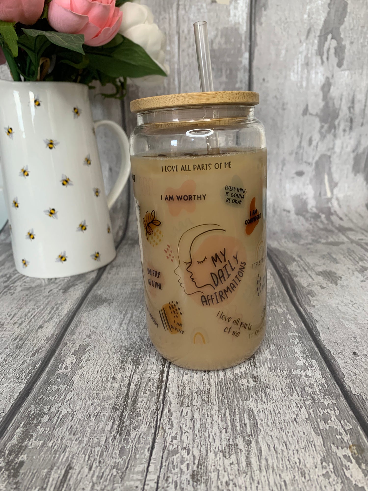 Daily affirmations glass cup with bamboo lid and solid plastic straw. Perfect for iced coffee!