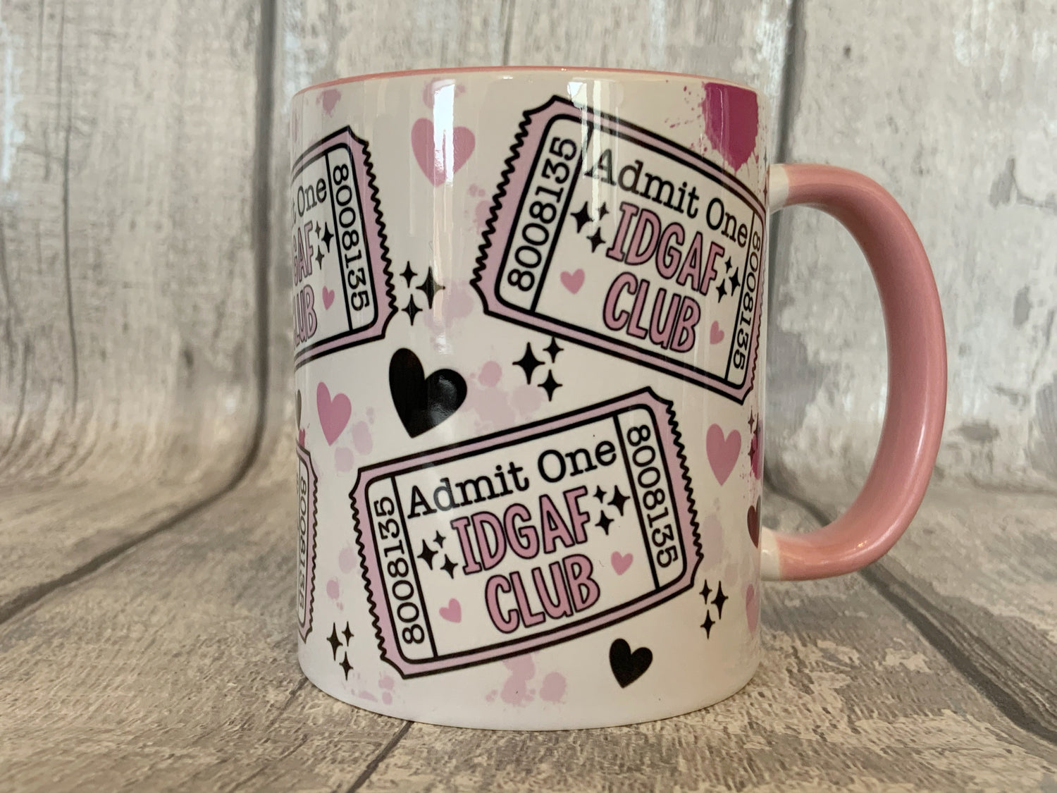 Pink handle and inner mug with IGAF tickets, featuring heart and graffiti prints. Made from high gloss ceramic, they are microwave and dishwasher safe.