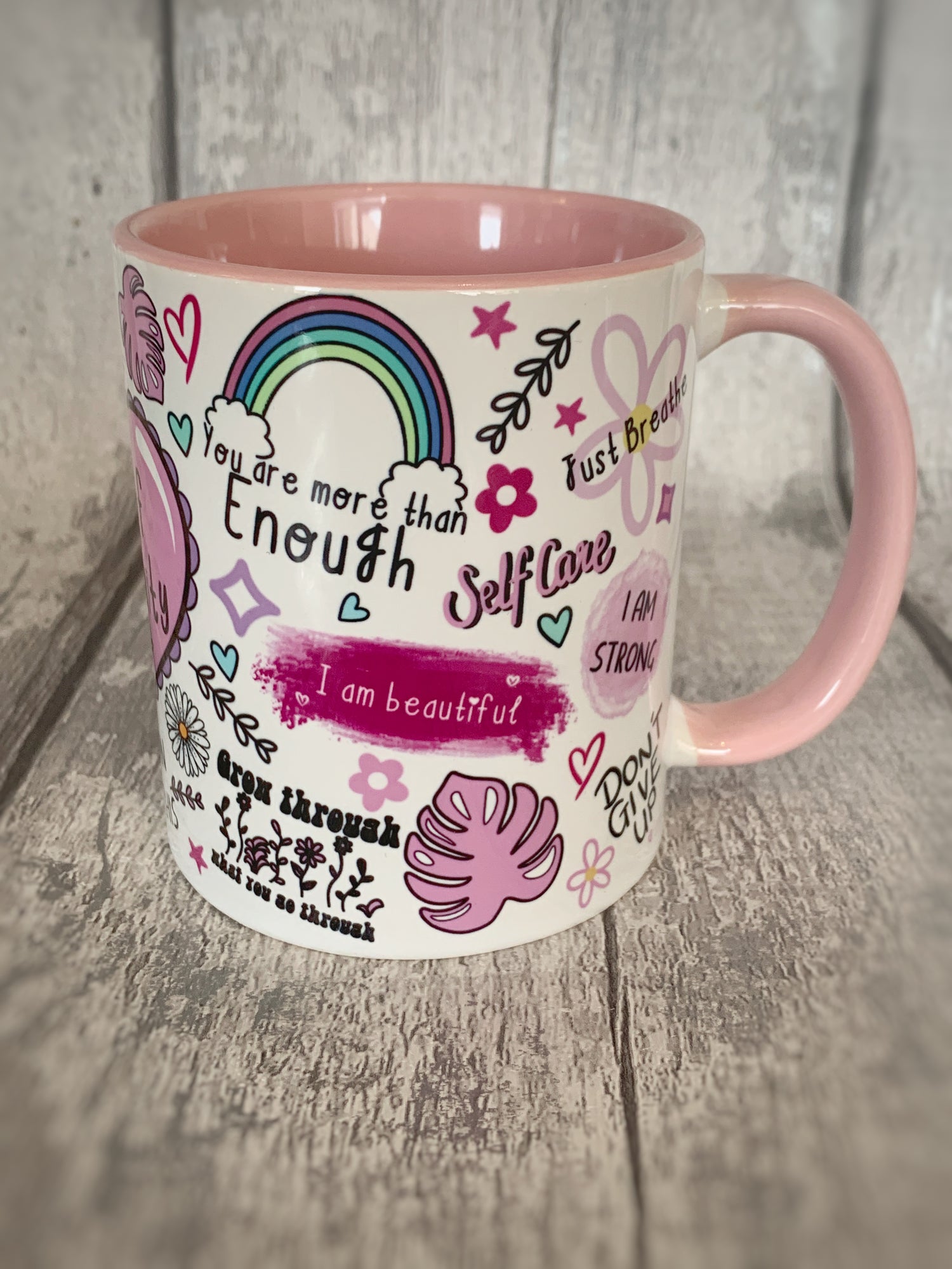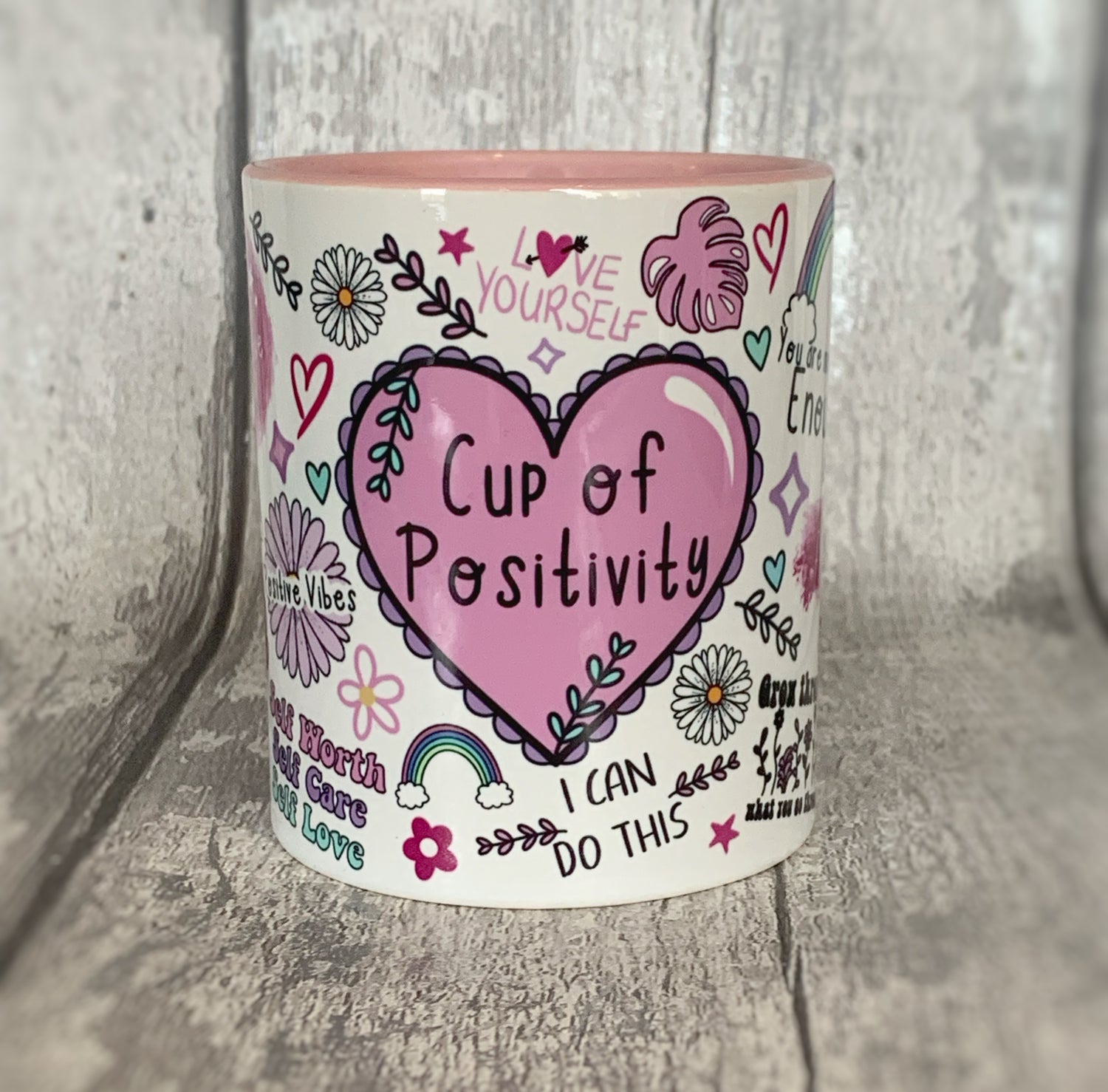 This pink positivity mug is the perfect way to remind yourself yourself just how amazing you are! Featuring pink positivity heart and affirmations. Made from high gloss ceramic, they are microwave and dishwasher safe.