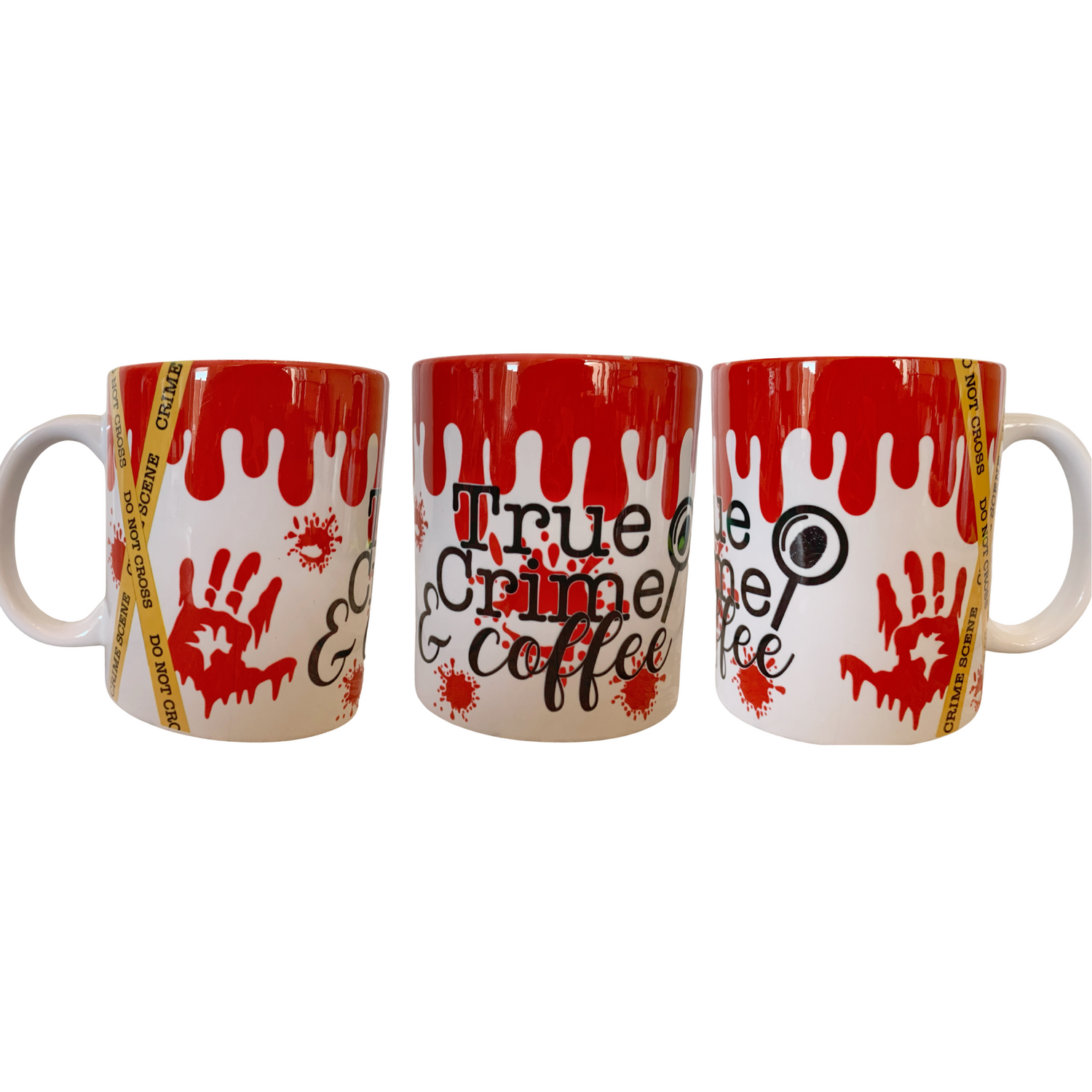 Featuring blood splatter handprints, crime tape and central wording, this wrap around design is a great gift for Christmas, birthdays, or just because.